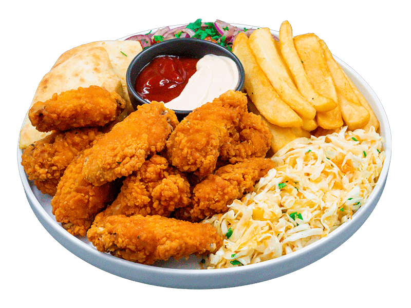 aripioare de pui pane, cartofi prajiți sau orez, salată de varză, chiflă