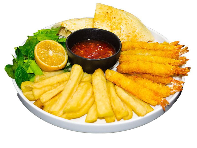 creveti pane,cartofi prajiti,salata iceberg,lamaie, chiflă